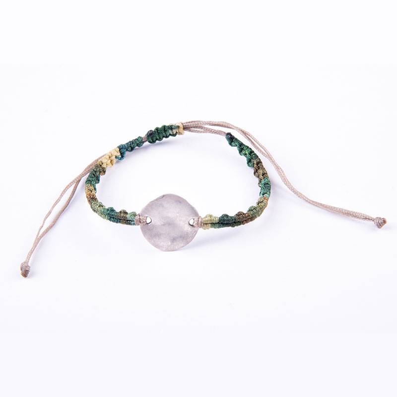Βραχιόλι μακραμέ με μεταλλικό μοτίφ δίσκο σφυρήλατο σε μούλτι πράσινο κερωμένο κορδόνι, κλείνει με αυξομείωση
