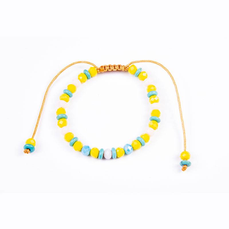 Βραχιόλι με κρυστάλλινες χάντρες 6mm λευκές, κίτρινες, τυρκουάζ, και ροδέλες χαολίτη τυρκουάζ, σε μπεζ κορδόνι με αυξομείωση