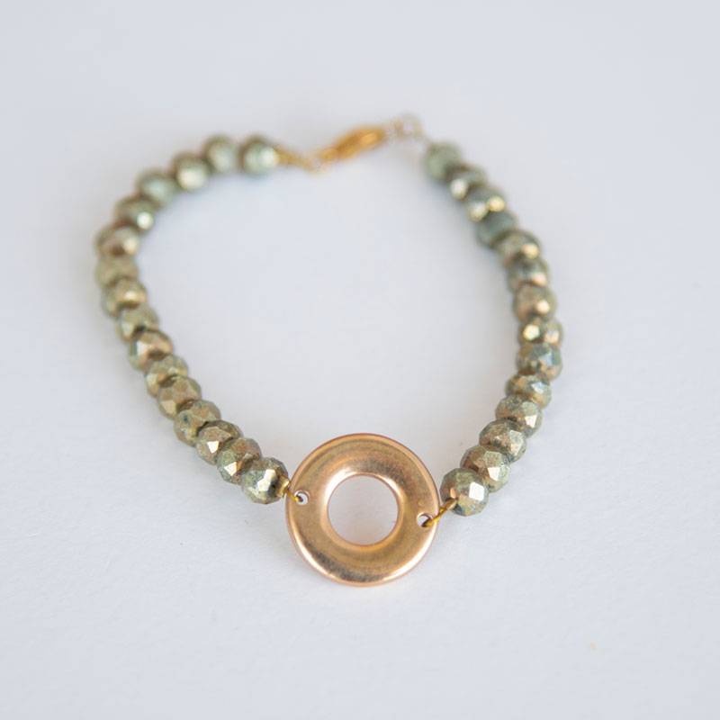 Βραχιόλι με μοτίφ ατσάλινο χρυσό κύκλος, κρυστάλλινες χάντρες σε χρυσό-πράσινο 6mm, και ατσάλινο κούμπωμα