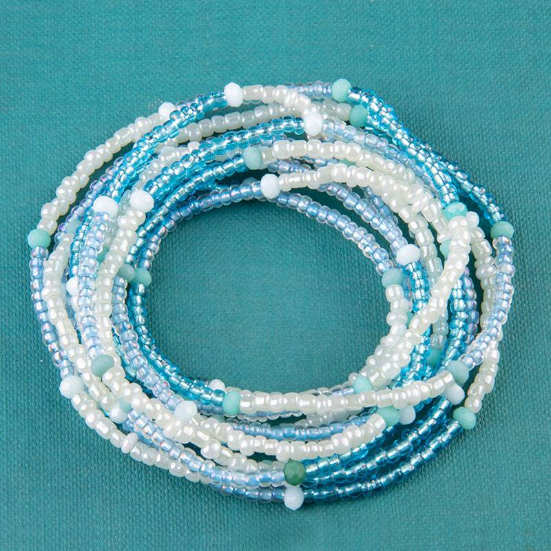 Βραχιόλι πολυμορφικό wrap με γυάλινες χάντρες ανοιχτό γαλάζιο, τυρκουάζ, μπλε διάφανο, κρυσταλλάκια ματ σε κορδόνι σιλικόνης