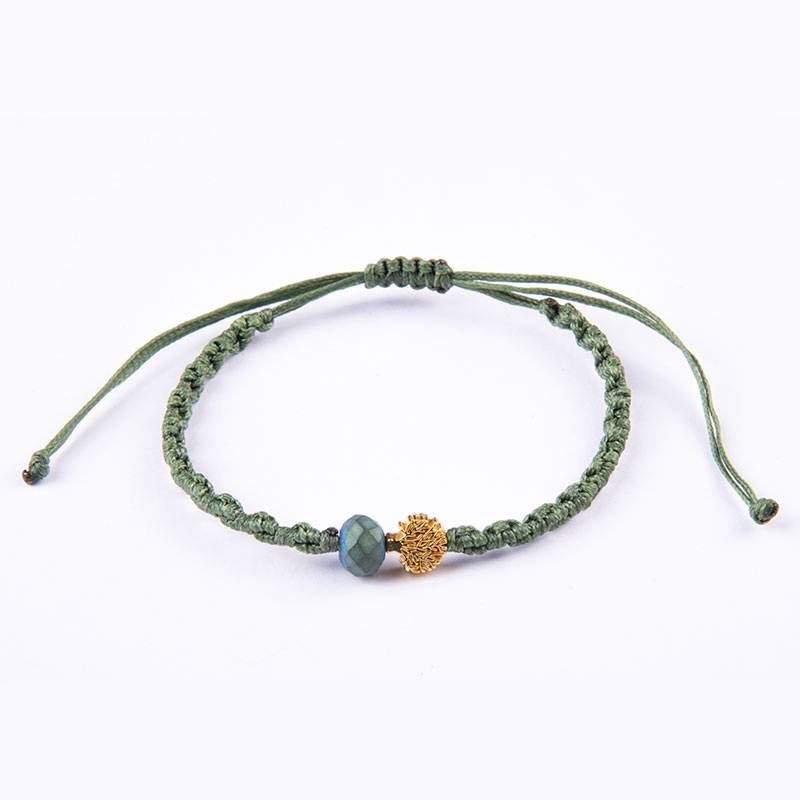Μακραμέ βραχιόλι με μεταλλικό στοιχείο δέντρο της ζωής χρυσό, με κορδόνι κερωμένο χακί, με κρυστάλλινη χάντρα 8mm με αυξομείωση
