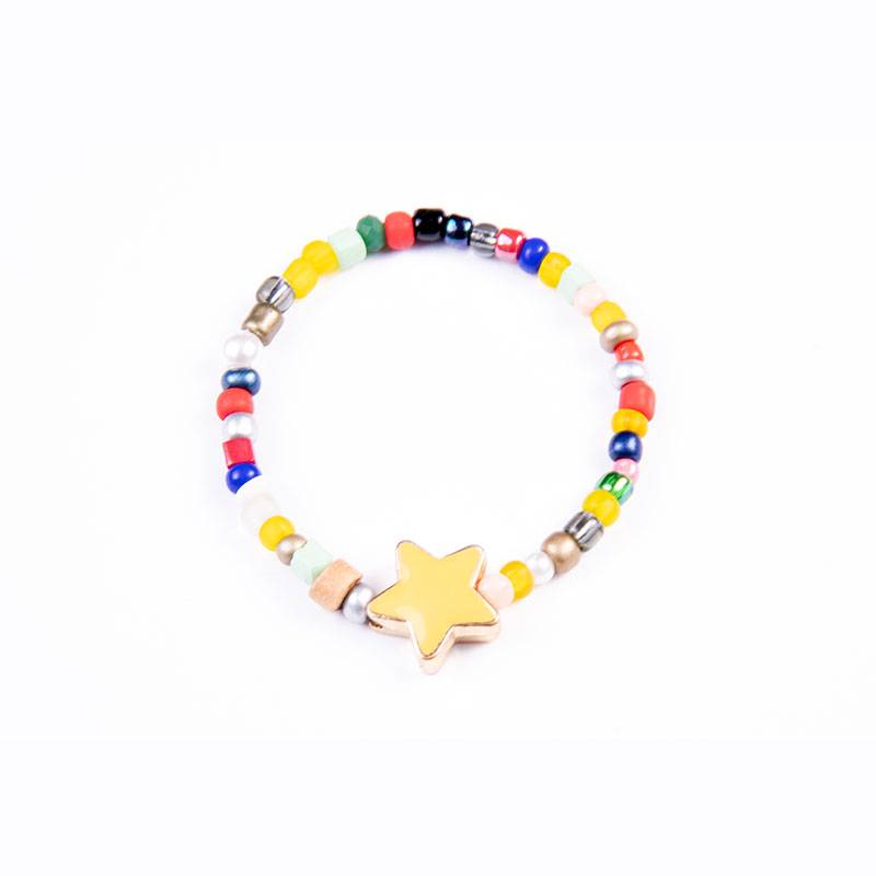 Παιδικό βραχιόλι πολύχρωμο με γυάλινες χάντρες και ακρυλική χάντρα αστέρι με σμάλτο κίτρινο, σε κορδόνι σιλικόνης