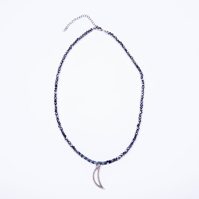 Χειροποίητο κολιέ με νίκελ κρυστάλλινες χάντρες, και αιματίτες 6mm, με επάργυρο μοτίφ φεγγάρι με γράνες και ατσάλινο κούμπωμα