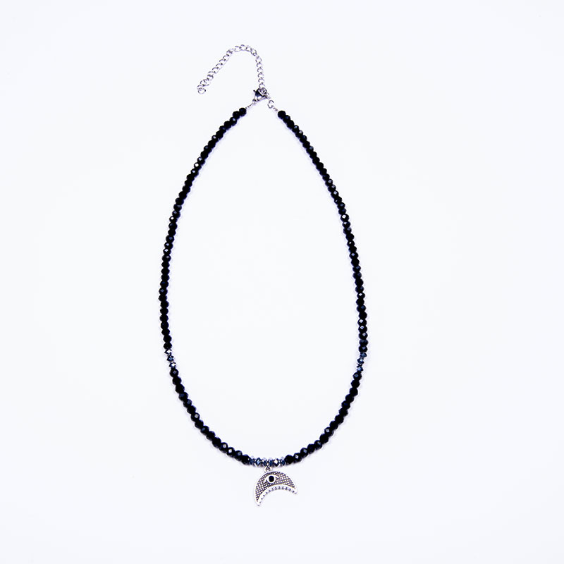 Χειροποίητο κολιέ με μαύρες κρυστάλλινες χάντρες 6mm και αιματίτες με επάργυρο μοτίφ μισοφέγγαρο με μάτι σμάλτο και ατσάλινο κούμπωμα