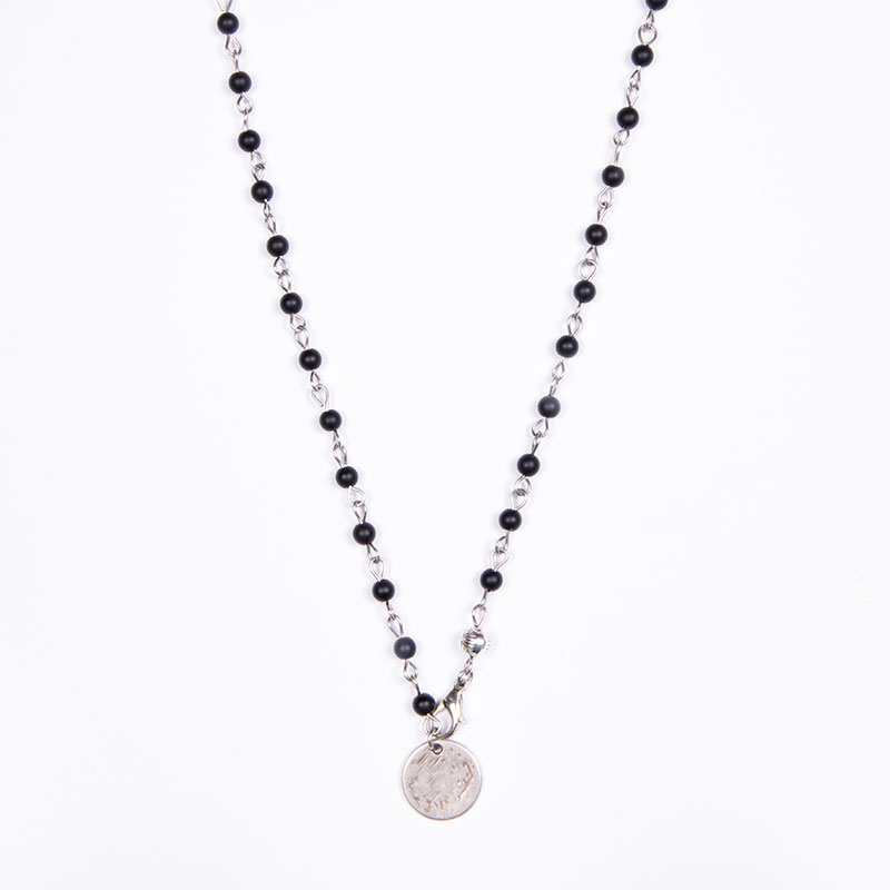 Ατσάλινο κολιέ ροζάριο με μαύρο όνυχα 6mm, μεταλλική χάντρα ματάκι, επάργυρο στρόγγυλο μοτίφ σαγρέ και ατσάλινο κούμπωμα