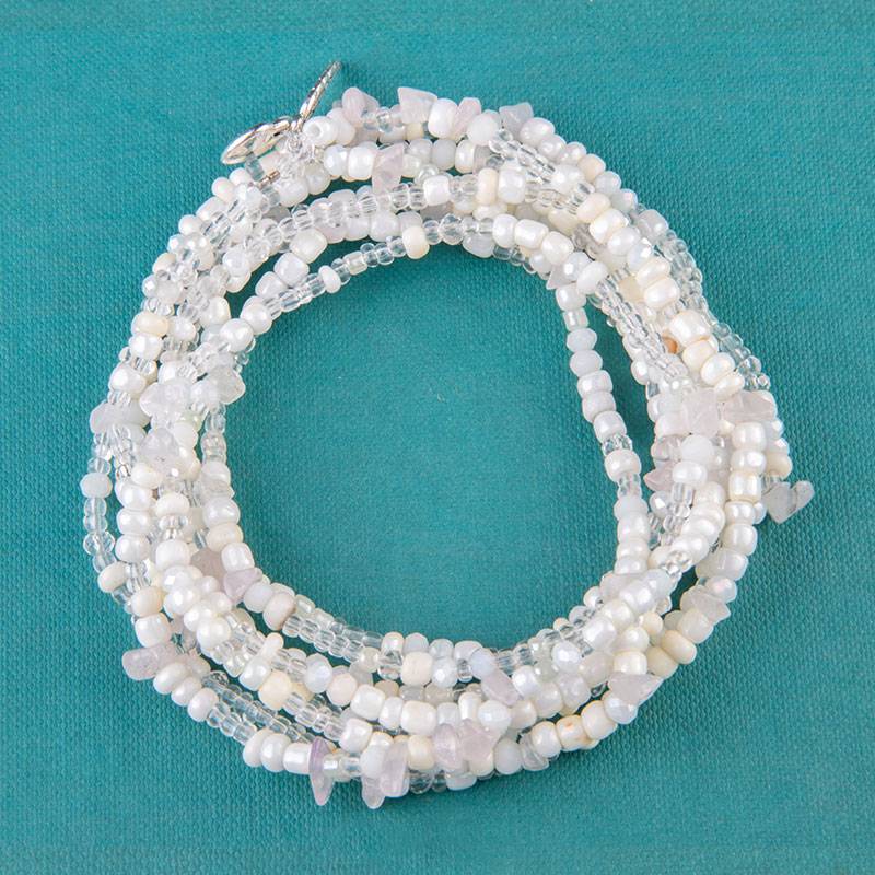 Βραχιόλι πολυμορφικό wrap με γυάλινες χάντρες λευκές, διάφανες,γυάλινα τσιπς διάφανα σε κορδόνι σιλικόνης