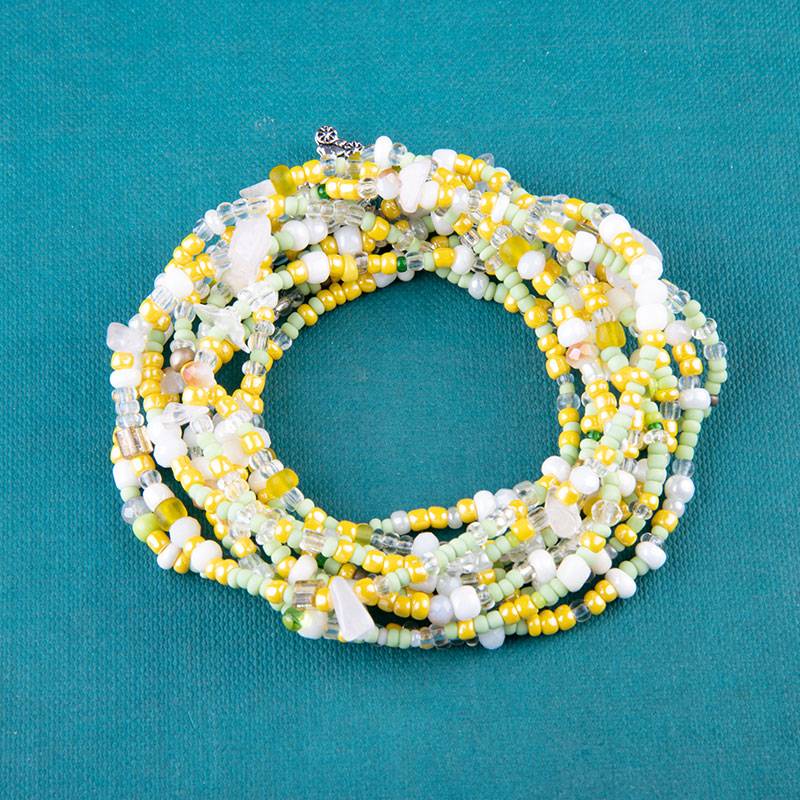 Βραχιόλι πολυμορφικό wrap με γυάλινες χάντρες λευκές, κίτρινες περλέ, διάφανες, γυάλινα τσιπς σε κορδόνι σιλικόνης