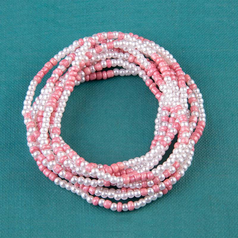 Βραχιόλι πολυμορφικό wrap με γυάλινες χάντρες ροζ και ακρυλικές πέρλες λευκές σε κορδόνι σιλικόνης