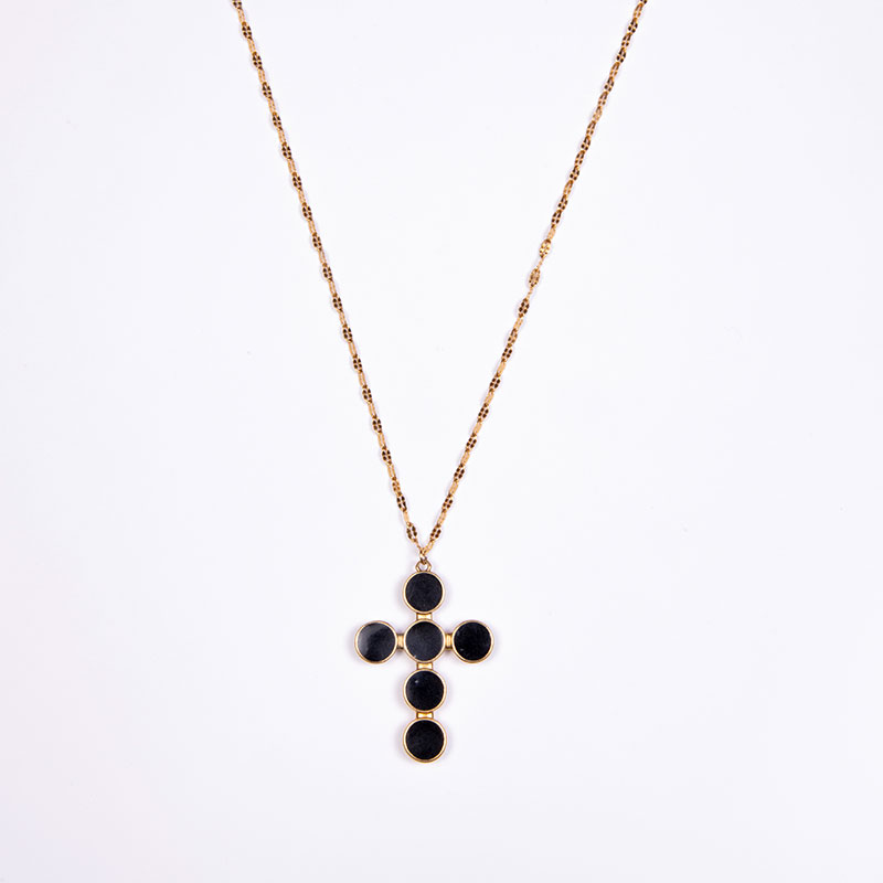 Κολιέ με ατσάλινη αλυσίδα θήτα gold και μοτίφ επίχρυσο σταυρό με μαύρο σμάλτο