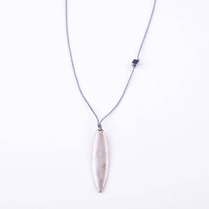 Κολιέ με μοτίφ μεταλλικό σανίδα του surf και τετράγωνη χάντρα αιματίτη, σε γκρι κορδόνι, κλείνει με αυξομείωση