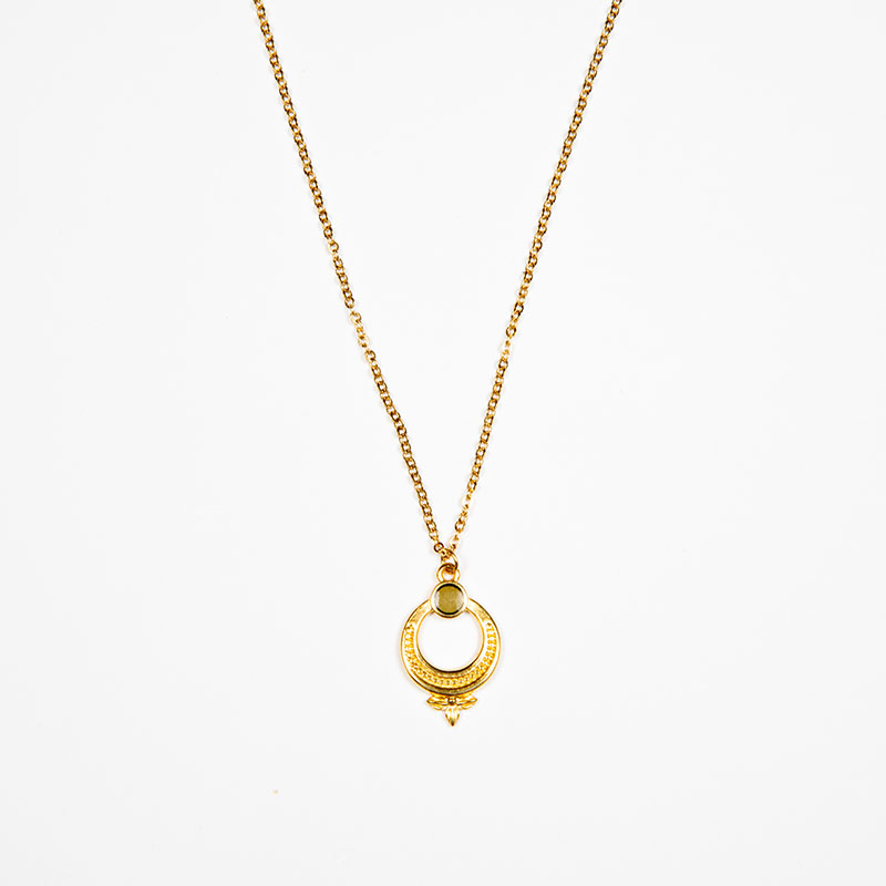 Κολιέ με χρυσή ατσάλινη αλυσίδα και έθνικ μοτίφ επίχρυσο 24Κ με χακί βιτρό λεπτομέρεια