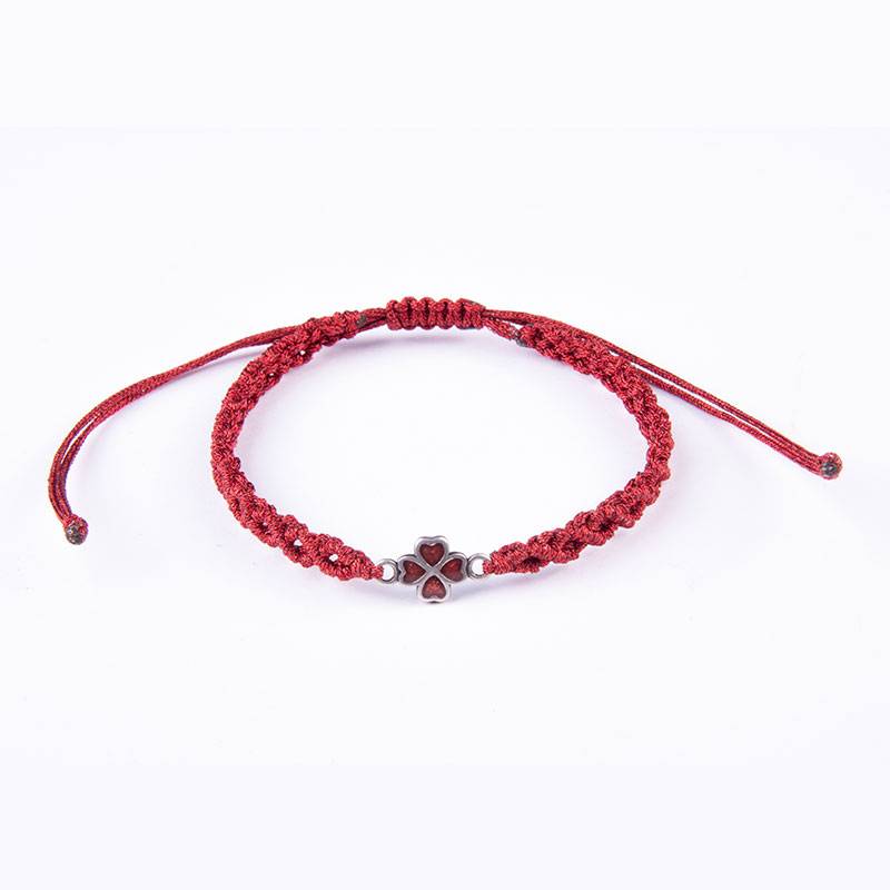 Μακραμέ βραχιόλι με μεταλλικό στοιχείο ασημί τετράφυλλο τριφύλλι με κόκκινο σμάλτο, με κορδόνι metallic red, με αυξομείωση
