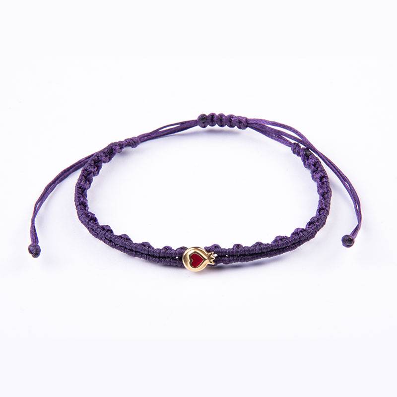 Μακραμέ βραχιόλι με μεταλλικό στοιχείο επίχρυσο ρόδι με καρδιά με κόκκινο σμάλτο, με κορδόνι μωβ, με αυξομείωση