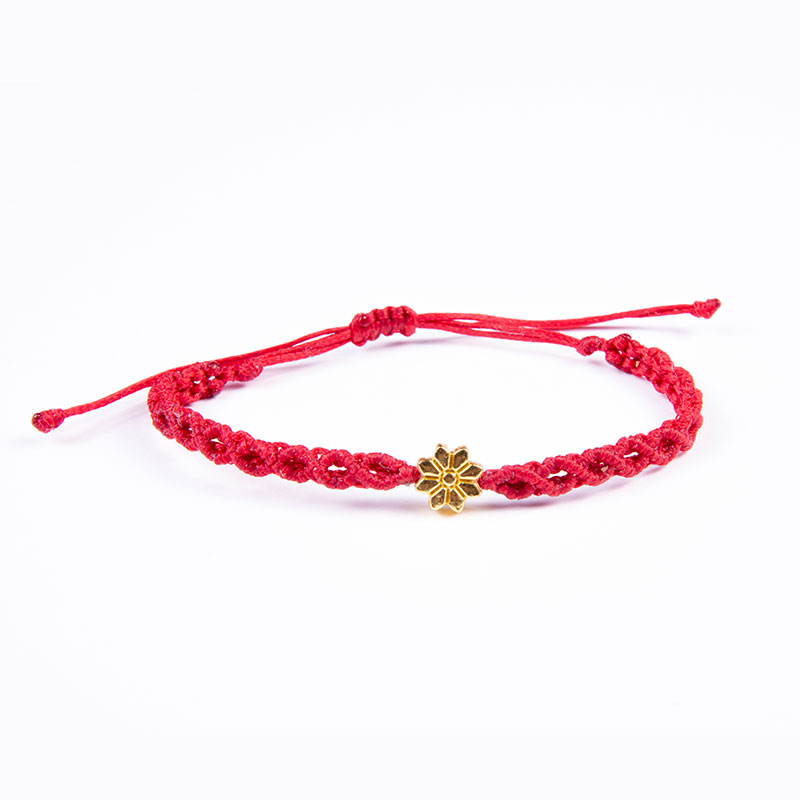 Μακραμέ βραχιόλι infinity με μεταλλικό στοιχείο λουλούδι, με κερωμένο κορδόνι κόκκινο, με αυξομείωση