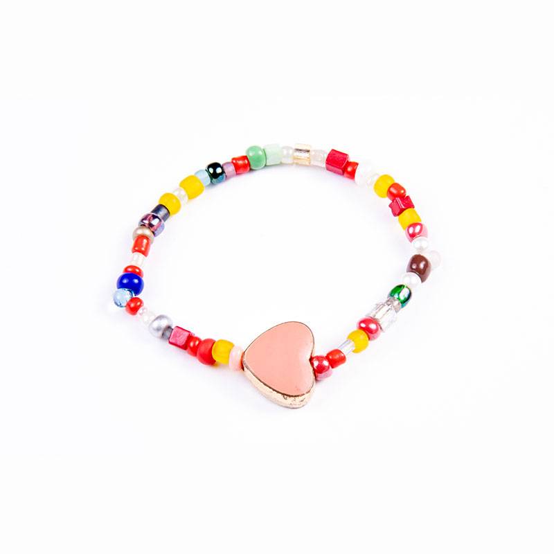 Παιδικό βραχιόλι με πολύχρωμες γυάλινες χάντρες και ακρυλική χάντρα καρδιά με σμάλτο ροζ