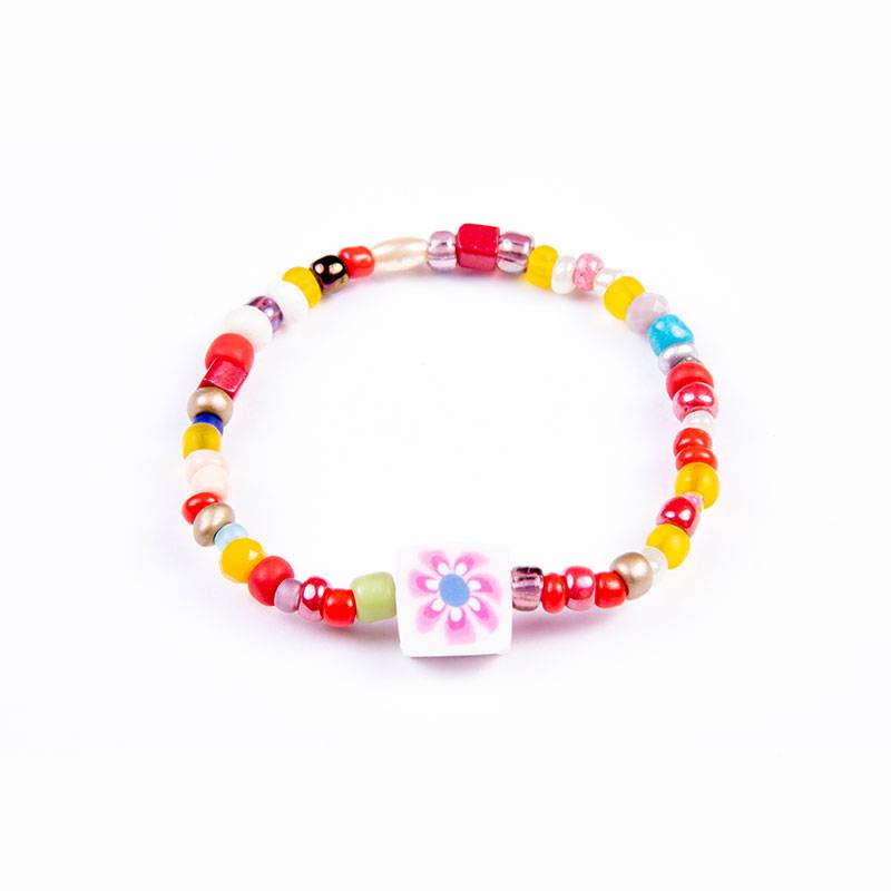 Παιδικό βραχιόλι πολύχρωμο με γυάλινες και χάντρα φίμο λευκή με λουλούδι, σε κορδόνι σιλικόνης