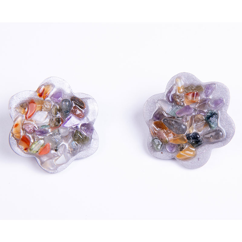 Σκουλαρίκια από πολυμερικό πηλό λουλούδι, γκρι, με ημιπολύτιμες πέτρες τσιπς mix και ατσάλινο καρφάκι