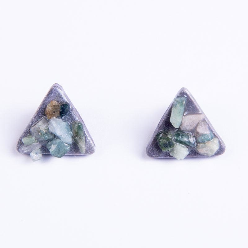 Σκουλαρίκια από πολυμερικό πηλό μικρά τρίγωνα γκρι, studs, με ημιπολύτιμες πέτρες τσιπς mix και ατσάλινο καρφάκι