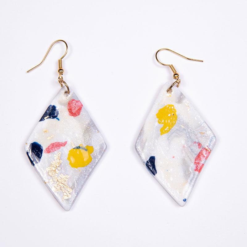 Σκουλαρίκια ρόμβος από πολυμερικό πηλό white pearl multicolor με φύλλο χρυσού και χρυσό ατσάλινο γαντζάκι