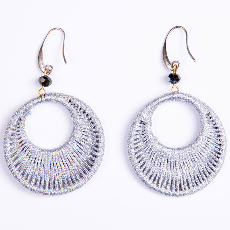 Σκουλαρίκια πλεχτά στρόγγυλα ασημένια, κρυστάλλινη χάντρα dark green, ορειχάλκινο γαντζάκι