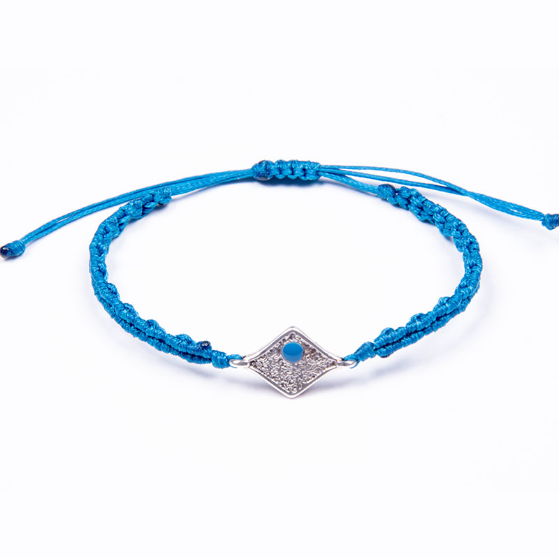 Χειροποίητο μακραμέ βραχιόλι με έθνικ μοτίφ ασημί ρόμβο με μπλε σμάλτο, με μπλε κερωμένο κορδόνι