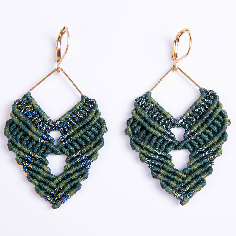 Σκουλαρίκια μακραμέ σε πράσινο και μετάλλικο πράσινο χρώμα με επίχρυσο μοτίφ τετράγωνο και ατσάλινο french hook επιχρυσωμένο