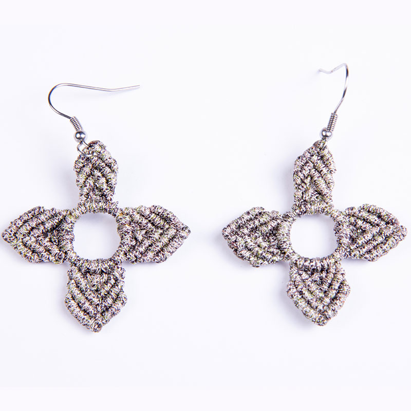 Σκουλαρίκια μακραμέ cross μεταλλικό γκρι με ατσάλινο γαντζάκι